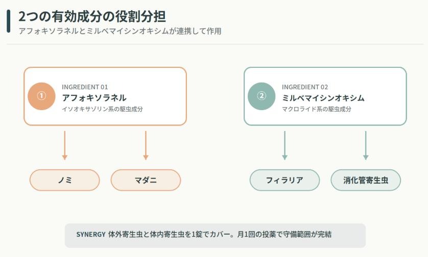 ネクスガードスペクトラには、ノミ・マダニを駆除する「アフォキソラネル」と、フィラリア幼虫や消化管内寄生虫に作用する「ミルベマイシンオキシム」の2つが有効成分として配合されています。このうちミルベマイシンオキシムは、犬糸状虫(フィラリア)の幼虫だけでなく、回虫、鉤虫、鞭虫にも効果を示す守備範囲の広い成分です。