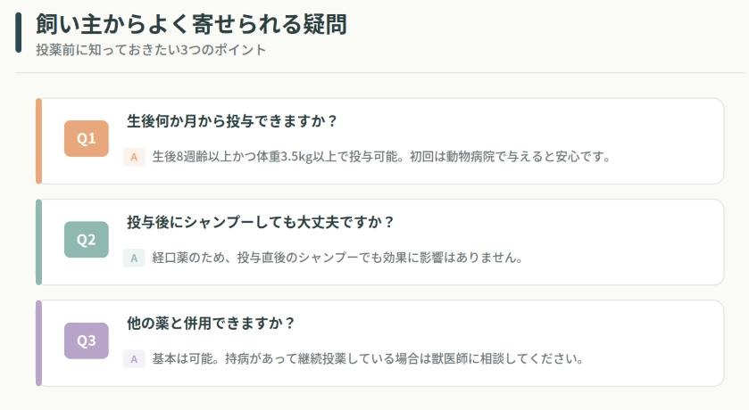 実際にネクスガードスペクトラを選ぶ段階で、多くの飼い主が同じような疑問を抱きます。ここでは特に頻度の高い質問に回答していきます。
