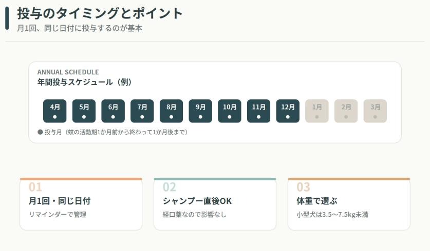 薬効を最大限に引き出すには、正しいタイミングと方法で与えることが欠かせません。小型犬ならではの留意点とあわせて解説していきます。