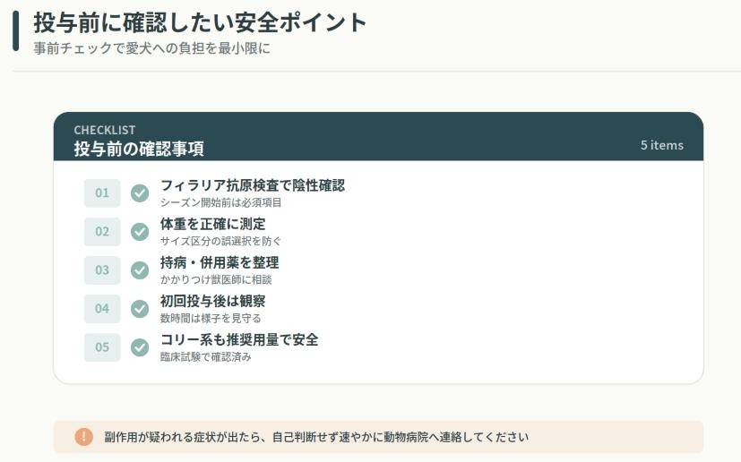 基本的には他の犬用医薬品と併用可能ですが、持病があって継続投薬している犬の場合は、事前にかかりつけの獣医師へ相談するのが賢明です。自己判断で複数のフィラリア薬やノミ・マダニ薬を重ねるのは避け、必ず1剤に絞って運用するようにしてください。