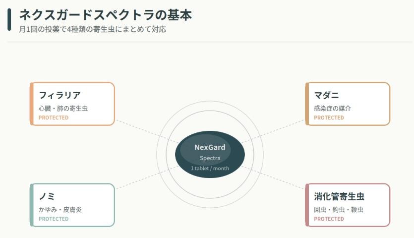 名前が似ているため混同しやすいのですが、両者は守備範囲が明確に異なります。通常のネクスガードはノミ・マダニ駆除に特化した薬で、フィラリア予防効果はありません。一方ネクスガードスペクトラはフィラリア予防と消化管寄生虫駆除を加えた上位モデルで、これ1錠で通年の寄生虫対策が完結します。「スペクトラ」という名前には「広範囲」という意味が込められており、その名の通り守備範囲の広さが最大のセールスポイントです。
